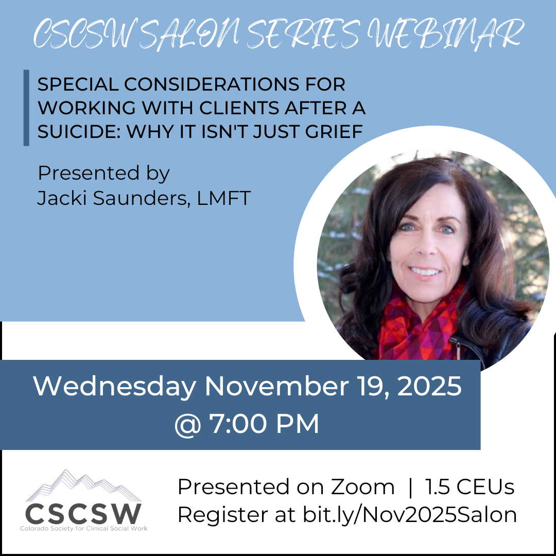 The Colorado Society for Clinical Social Work (CSCSW) is the only professional organization in Colorado that exclusively represents the interests of clinical social workers and their clients.