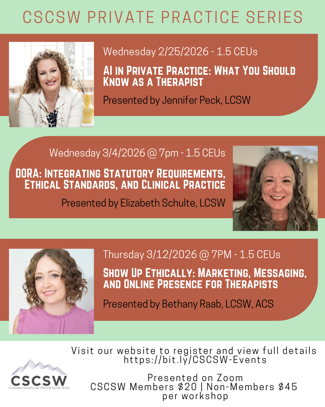 The Colorado Society for Clinical Social Work (CSCSW) is the only professional organization in Colorado that exclusively represents the interests of clinical social workers and their clients.